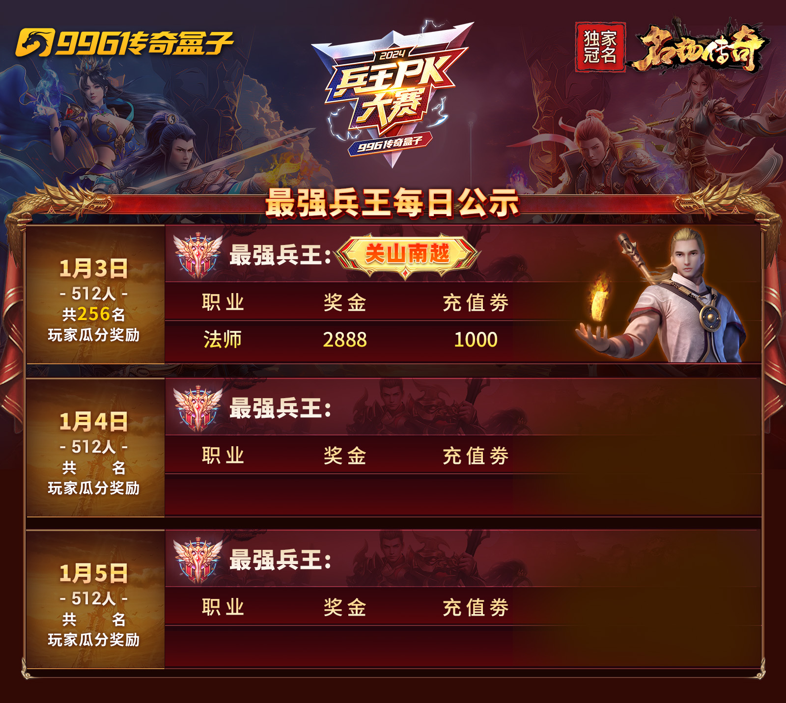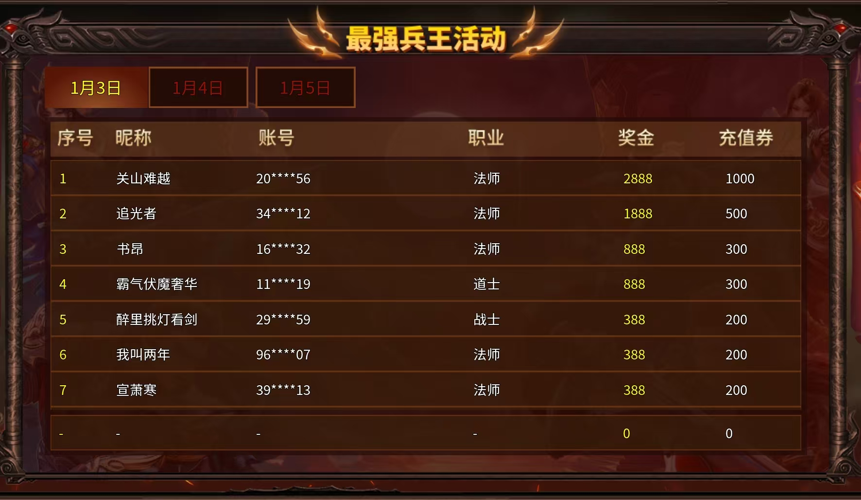 1月3号最强兵王赛第一天正式开启,首战PK地图【猩红尖刺】,法师职业一骑绝尘,前7名中有5名都是法师职业,而第一天诞生的最强兵王选手-关山南越也是法师职业。不知道有没有朋友观战昨日第一名的PK较量呢!