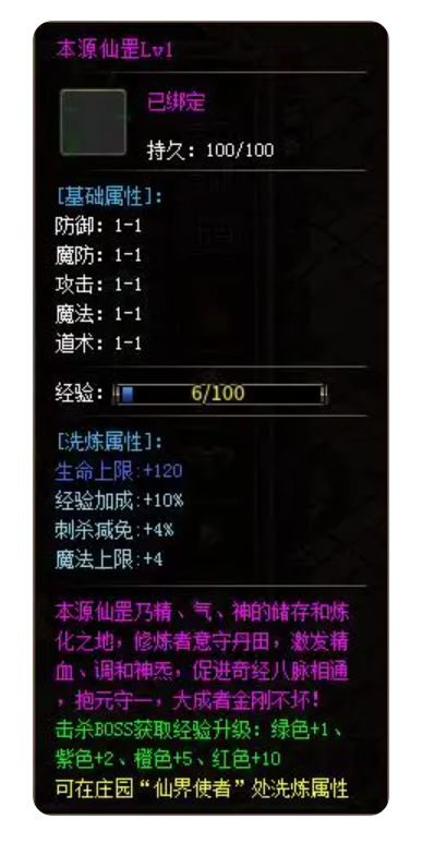 成长性装备:从进游戏送的 “降妖幡” 开始,就能跟着玩家刷怪升级,满级进化成 “伏魔幡”,切割伤害一路飙升;免费获取的 “本源仙罡”,靠打 BOSS 攒经验,洗练时保底出 4 条属性,运气好还能解锁第 5 条,橙色属性更是能让战力翻倍;前期刷怪就能捡的 “弑魔戒指”,升级后也能成高阶神装,堪称平民玩家的 “宝藏装备”。