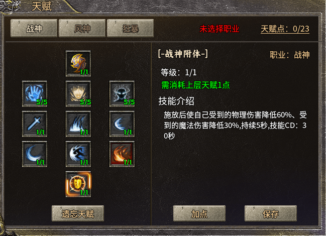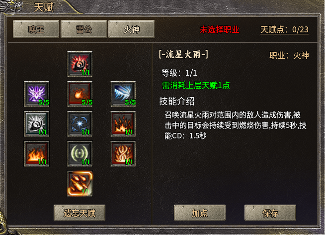 本服的天赋系统并非随机赋予某个孤立的小技能,而是设计了一套完整的天赋树。三职业各有3套天赋树可以发展,不同的天赋有不同的专精方向,战士有战神、风神、狂暴,道士有兽王、毒王、符神,法师有唤王、雷公、火神。形成9个方向的职业发展,供玩家自由选择,天赋在48级之前可以不限次数的免费切换,做足了三职业的细化与丰富,变单纯为细腻。