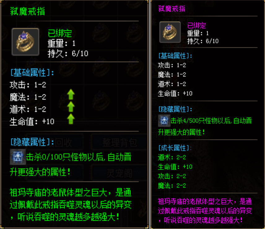 前期还能很容易地获得大量的弑魔戒指,由于其初始的基础属性较为平庸,很容易被玩家忽视。其实它也同样拥有进化能力,从普通到高阶相当战力不凡。而本服对散人及新手的诚意即写在这些点滴细节中,还是那句话“只要去积累保你有收获”。