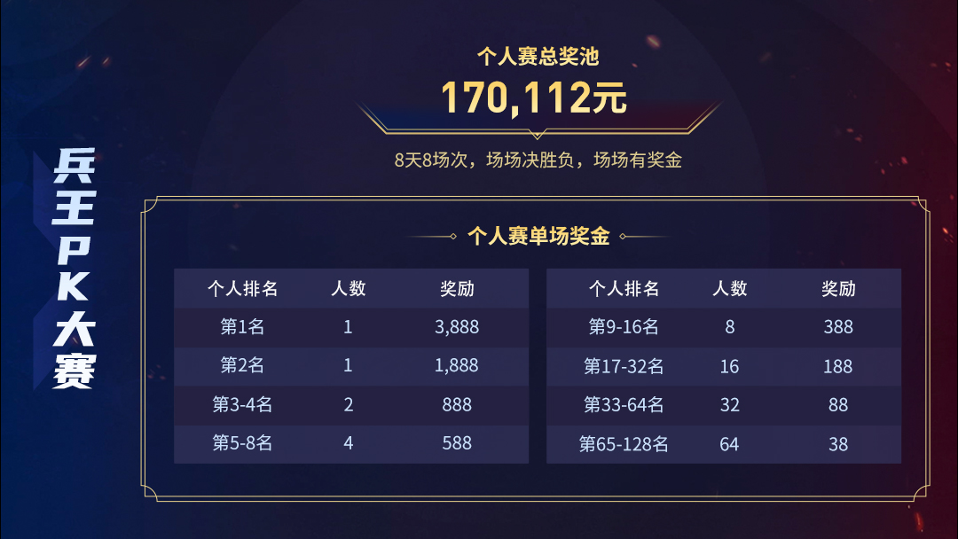 996兵王PK大赛为散人赛事,总奖金170112元,8天8场个人极限淘汰赛,每日512个参赛名额,两两随机匹配,5局啥胜,胜出的玩家进入下一轮对战,每场比赛当天决出冠军,共计八个冠军名额。是时候证明谁才是真正的单挑之王了!