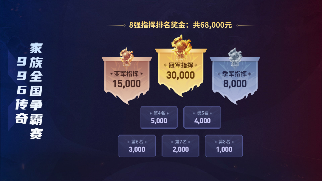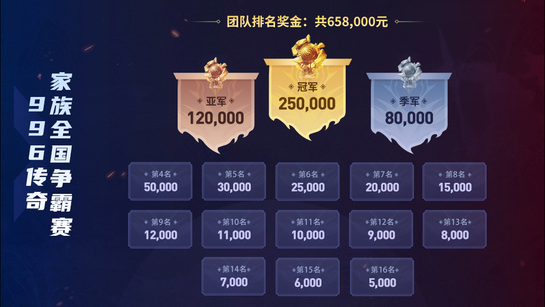 996传奇家族全国争霸赛为团队赛事,总奖金770500元,本次共邀约16支精英队伍,共13场排名晋级赛角逐冠军,16支精英队伍将为各位热爱传奇竞技的兄弟们带来一场视觉与激情的盛宴!